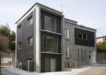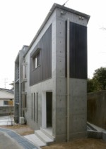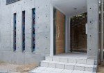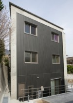 戦前からの古い街並みである周辺環境を配慮し、外断熱の仕上として木の竪格子をあしらった鋼板と、経年しても表情を変えないコンクリート打放しを織り交ぜた結果、新築にも関わらず周辺環境と調和したデザインとなった。